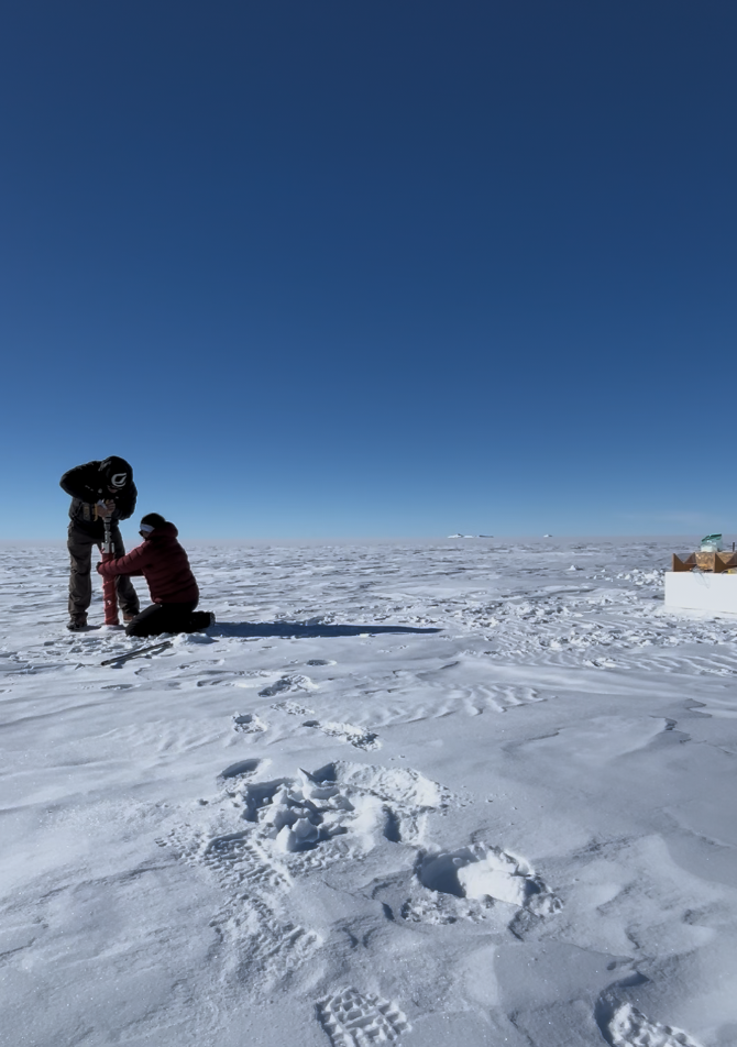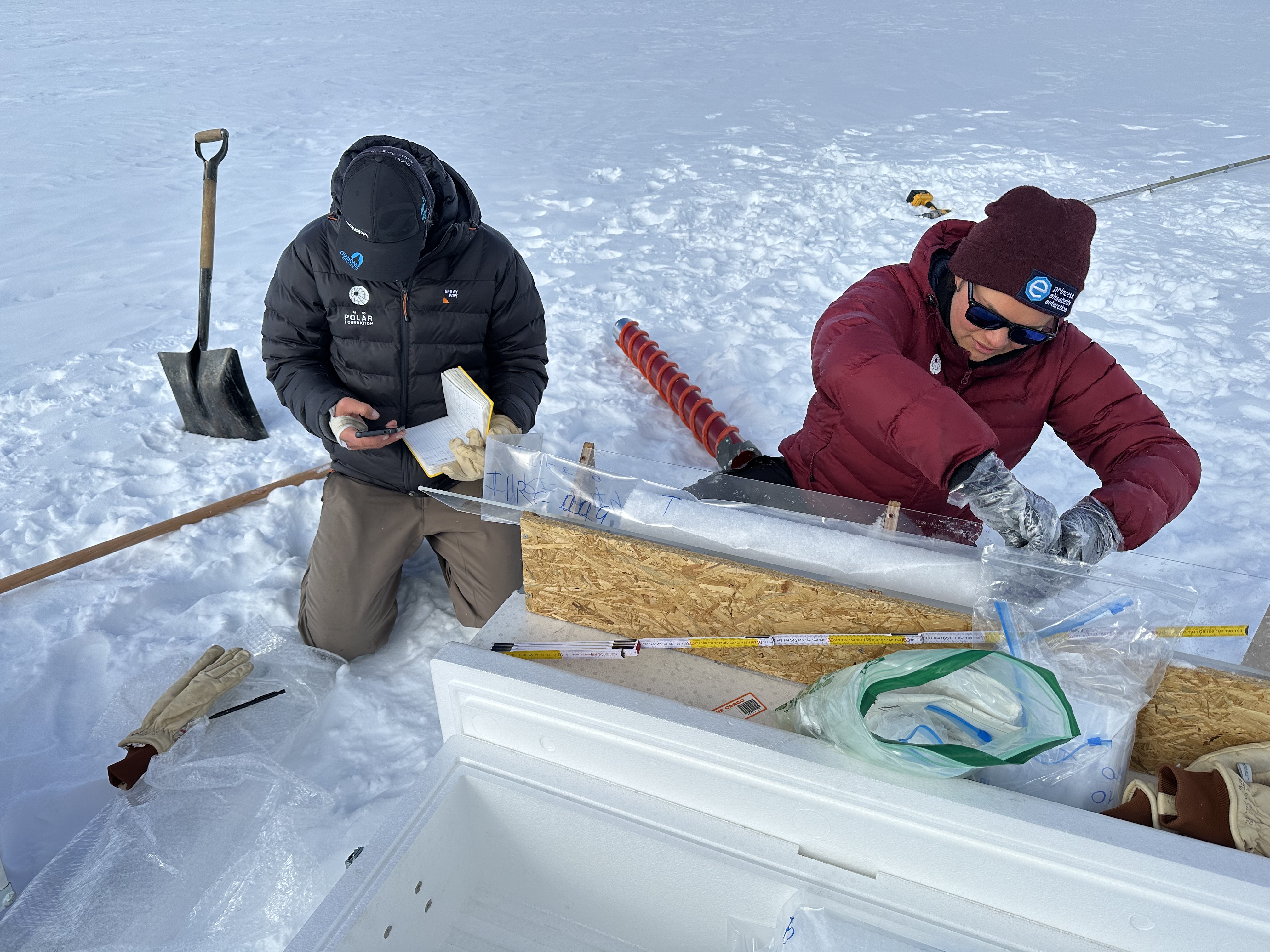 ULB scientist Sarah Wauthy and field guide Sebastian Corret prepare a snow core taken near PEA for the PASPARTOUT project, which is looking at the atmospheric transport of various particles from the the mid-latitudes to Antarctica...