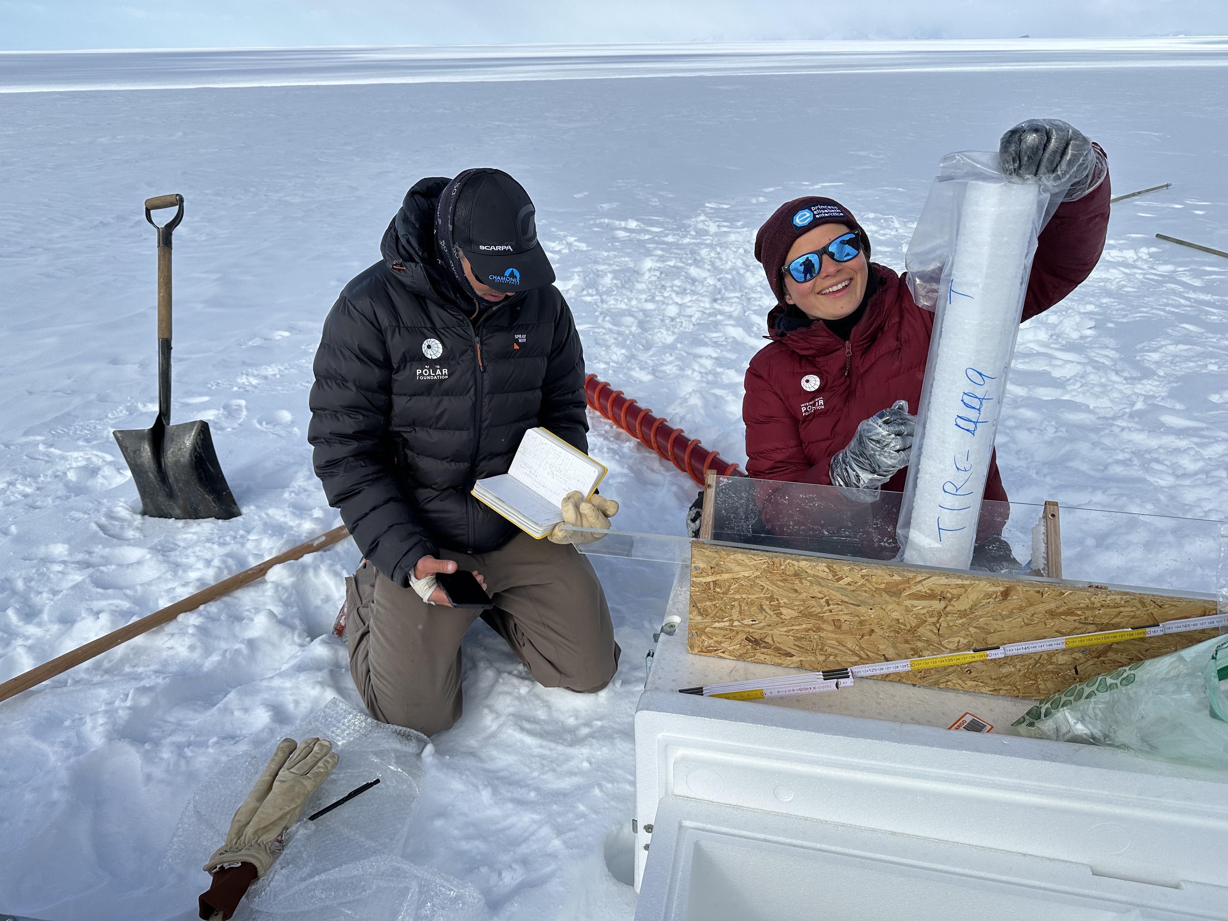 Sarah and Sebastian with a snow core near PEA PASPARTOUT project