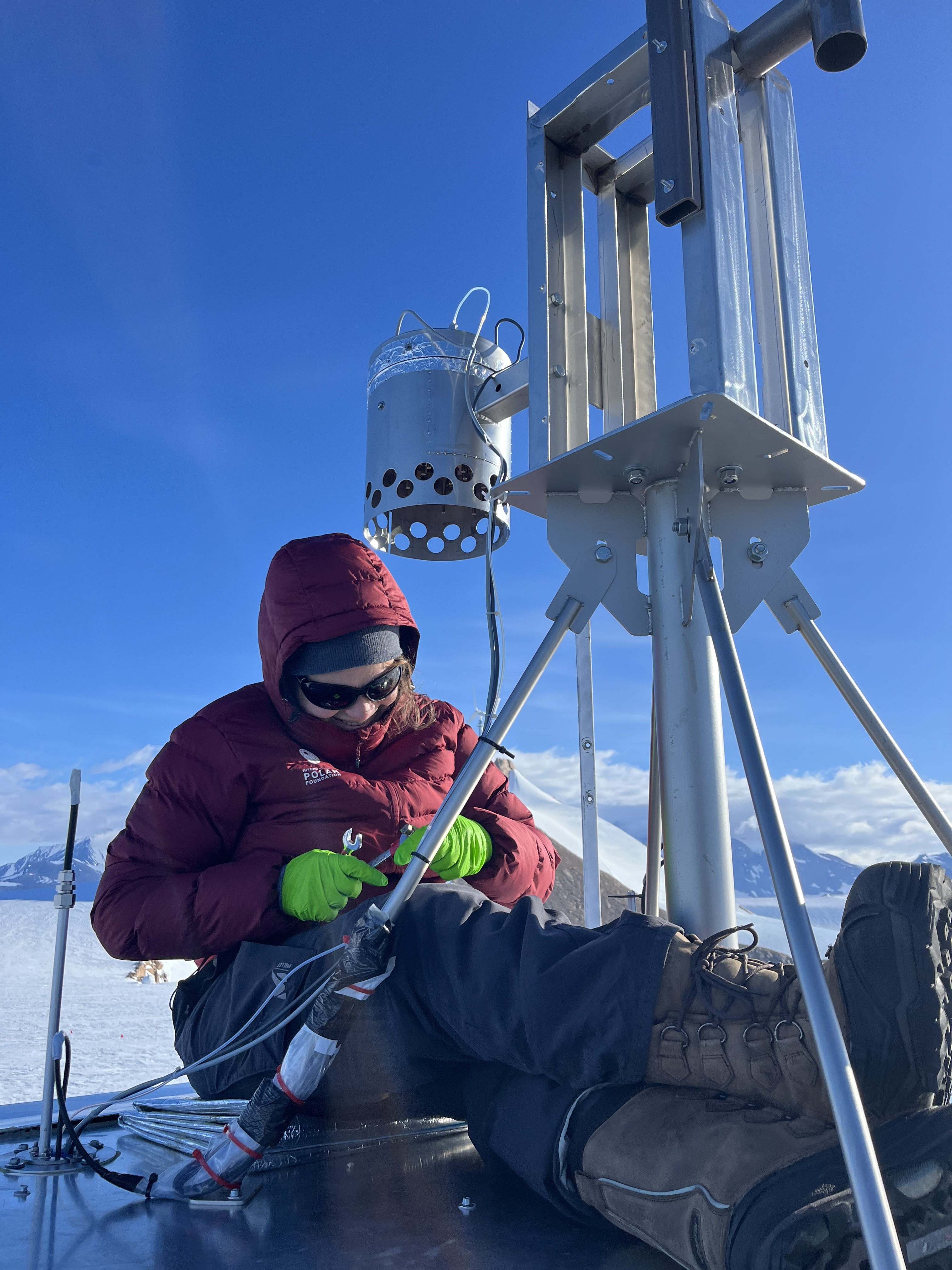 Sarah Wauthy (ULB) poses with particle sampler installed on the PEA’s south scientific shelter for Ghent University as part of the PASPARTOUT project.