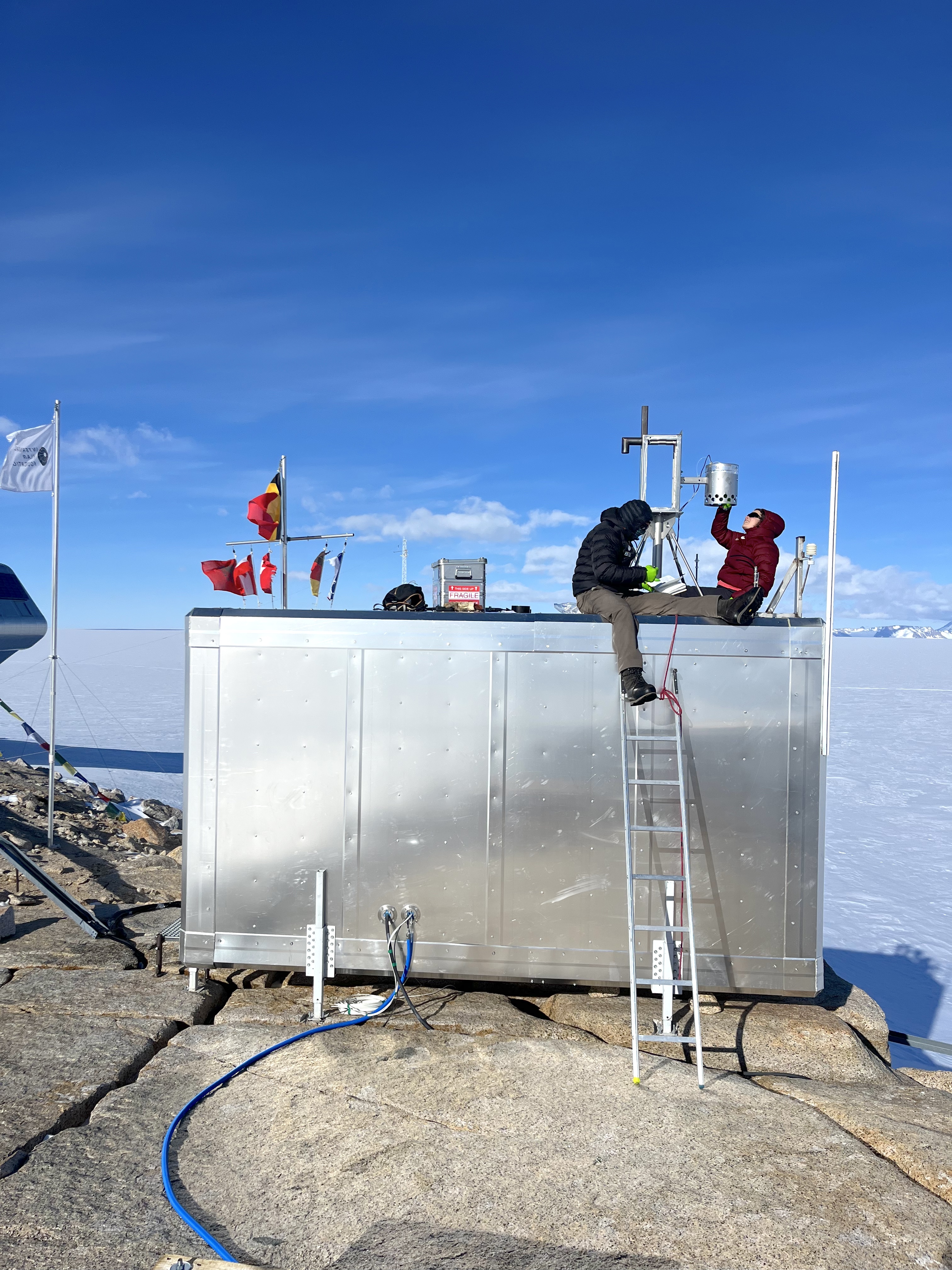 Sarah Wauthy (ULB) and fiend guide Sebastien Corret colelct tubes from the Volatile Organic Compound (VOC) auto sampler installed on the PEA’s south scientific shelter for Ghent University as part of the PASPARTOUT project.